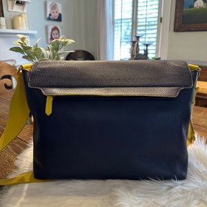 This navy and yellow messenger bag is in AMAZING condition. She looks barely used. There is a zipper pocket on the back and one inside. The interior is suede and CLEAN! Flap has a double magnetic closure and the CLEAN yellow strap is adjustable!