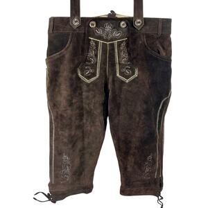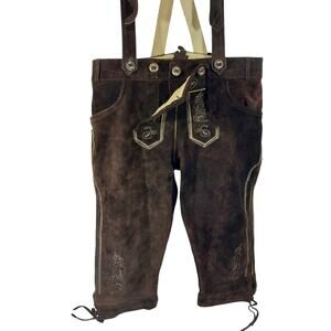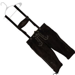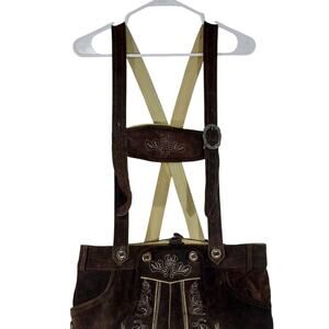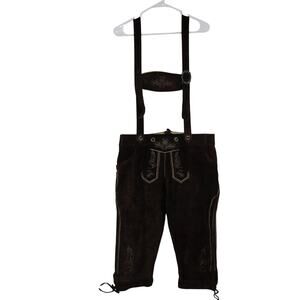 Directly and authentically from Germany! These Lederhosen are just gorgeous, with the traditional Bavarian accents and flair! In chocolate brown genuine suede leather with tan embroidery, they feature fabulous tailoring and exquisite detail! Includes the button on susoender/bib! Bone buttons, fully lined inside in brown poly satin! Laced toe calves, front and back pockets! Laced back for a perfect fit! Perfect for Oktoberfest- or anytime! Size 34, (German Size 52), worn once! Priced so low due to a flaw: the right buckle in the front bib is missing, so the right side is permanently affixed. Plz see pix, Otherwise: Excellent! Superb EUC Condition! **ABSOLUTELY GUARANTEED CONDITION: EUC MINTY-EXCELLENT TO LIKE-NEW, by Lily @HauteClub!***