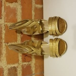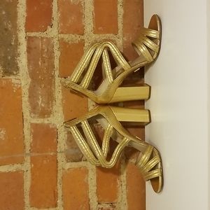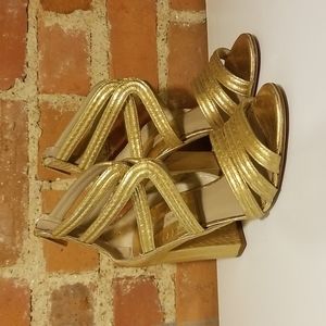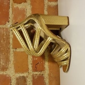 GORGEOUS MICHAEL KORS METALLIC GOLD SNAKESKIN LEATHER STRAPPY HEELS DESIGNER HOT
