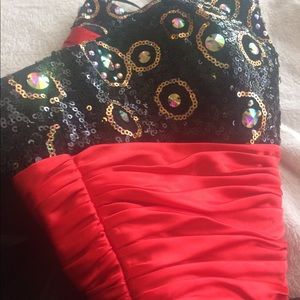 Beautiful Strapless True Red Belt Formal Knee Length Dress. With A Pop Of Black And Gold Sequins Around The Chest. Including A Flattering Corset In Back! Made With 100% Polyester. Comment If Dimensions Needed