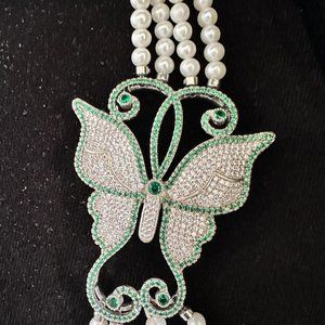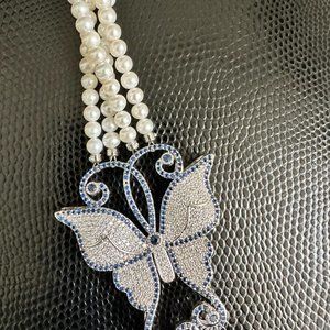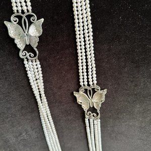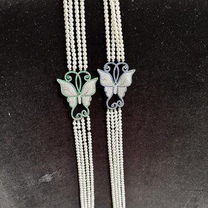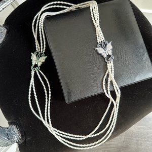 Very long and stunningly beautiful seed pearl necklace with silver crystallized butterflies -one in Indigo Blue and the other Green. No clasp - just one long continuous strand. A great look! Used for a photo shoot - Brand New!