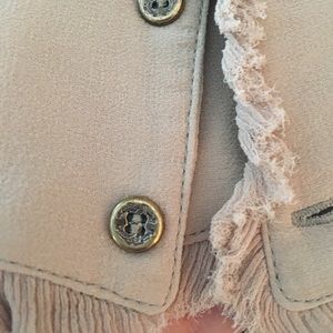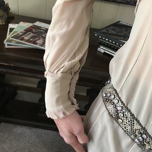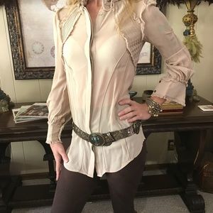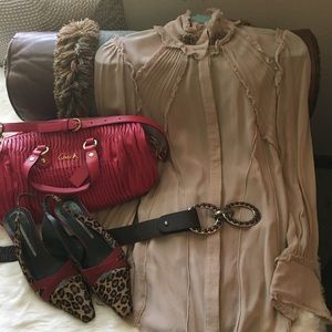 Roberto Cavalli gorgeous detailed taupe blouse with narrow fraying, pin-tuck detailing, rolled cuffs with Cavalli embossed buttons. Stunning and versatile purchased at the amazing Gorsuch, worn once, freshly dry cleaned. See my closet for the one in white.