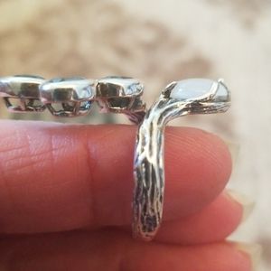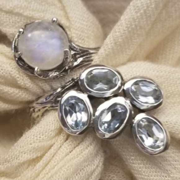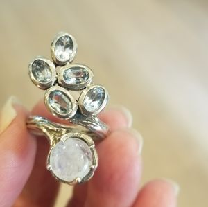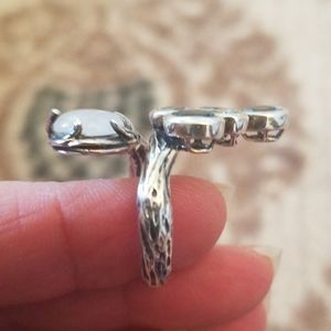 Very Unique. Appears to be handmade with possibly light colored aquamarine. Absolutely gorgeous. Tree bark like detail on band. Size 7.