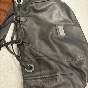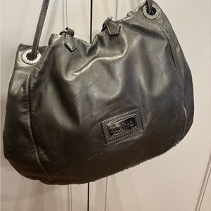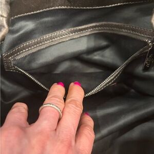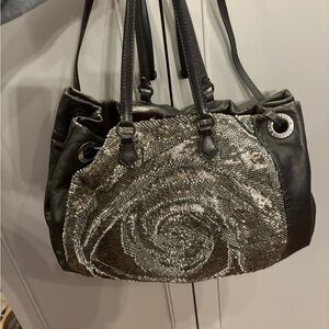 Sparkling silver and gold sequins adorn the front of the bag set on supple chocolate leather!