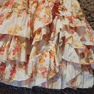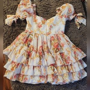 This dress is lovely! Made from whimsical pink/orange floral and ribbon cotton. Multilayer tiered cotton skirt and full puff sleeves. Bodice is lined. NWOT - only worn to try on for pics.