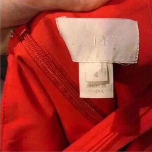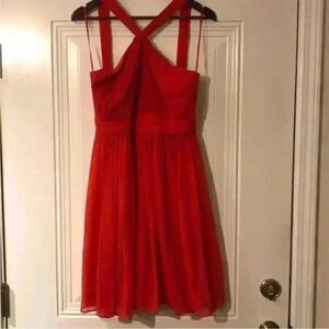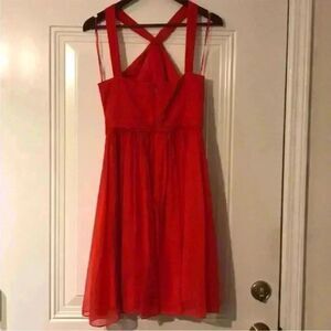 From JCrew's bridesmaid collection - crepe, knee length. Twist Halter neckline. Orangey-red