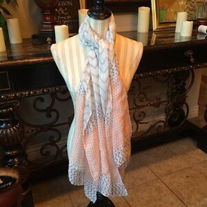 Gorgeous Blue Pink n Cream Scarf NWOT to wear however you want. Scarf, Shawl, Hair, Top, Skirt! Styling samples shown. Pale Pink & Blue Light Denim Matching Scarf!