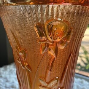 GORGEOUS~‘JEANETTE MARIGOLD’~GOLDEN AMBER~CARNIVAL GLASS VASE~STYLIZED DAFFODIL MOTIF~ART DECO RIBBING~SO PRETTY WHEN LIGHT HITS IT~FLUTED RIM~1930’s