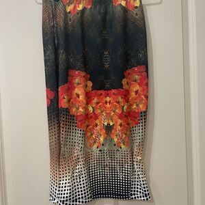 Gorgeous Orange with Laser Cut Out Pencil Skirt! Elastic waist eyelet sexy detail with a burst of gorgeous bright orange florals amidst a muted gray green ish palette. This is a work of art.
