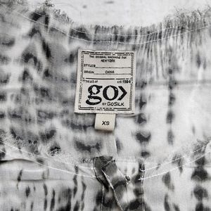 This is a beautiful GoSilk blouse in size XS. There are a few snags, as shown in the fourth picture; otherwise in great condition. Measures approximately 25" in length.