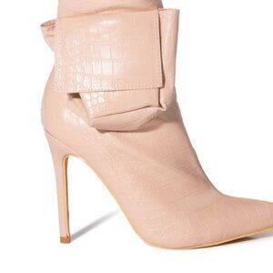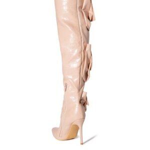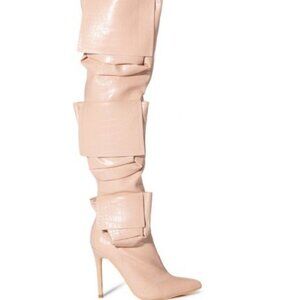 " GOT IT IN THE POCKET " Over The Knee Croc Stiletto Cargo Boot In Nude is made from a croc-embossed vegan leather upper and features an over the knee shaft, a pointed toe silhouette, cargo flap side pockets decreasing in size, a stiletto heel, and a side ankle zipper closure.