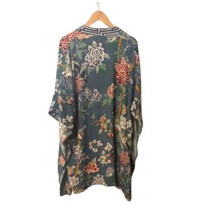 Beautiful boho-inspired floral kimono from the GP & J Baker x H&M designer collaboration. Features rich botanical prints, drapey sleeves, and Greek-key trim detail around the neckline. Lightweight and flowy — perfect as a robe, cover-up, or layering statement piece.