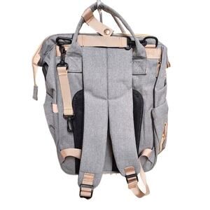 NWT: Versatile, grey & tan polyester/mesh multifunctional baby changing backpack with insulated bottle pockets / adjustable straps / USB charging port / padded / multiple zip & open pockets / portable / waterproof / clear ID slot by GPED.