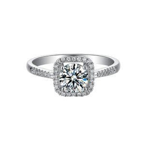 This solitaire engagement ring features a round 1ct center stone and 1/2 ct halo moissanite gemstone set in 18ct white gold over sterling silver, which adds durability