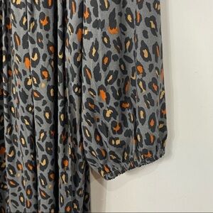 New comfy gray long sleeve dress featuring animal leopard print and drawstring neck tie keyhole front. Elastic stretch waist & line sleeve cuff. Unlined.