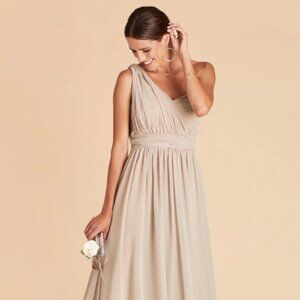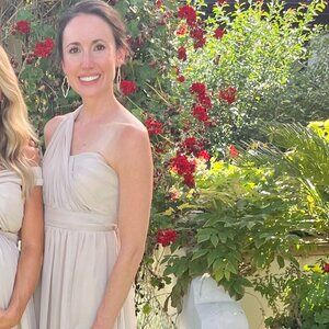 A flowy, ethereal bridesmaid dress you can wear in multiple ways. Color is called neutral champagne. It was worn once, is dry cleaned, and was not altered or hemmed. It can be tied in multiple ways, all of which can be found on the Birdy Grey website. Original selling price was $119. It is size XS and for reference, I am 5'5 and 108 lbs. I also wear a size 34 A bra, so if your chest is bigger, I might suggest one size up as this one fit me perfectly.