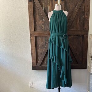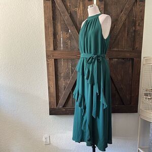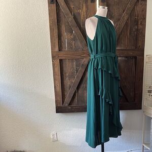 New no tag , This teal midi dress features a halter neckline, asymmetrical ruched details, and tiered skirt for a dynamic and flowing silhouette. 98% Polyester, 2% Viscose