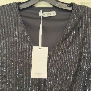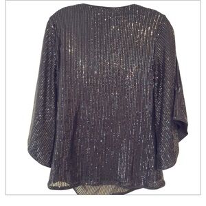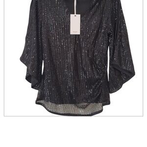 V-neck, 3/4 sleeves with flared cuffs, and a slightly draped or ruched effect on one side of the front. lightweight fabric is covered in shimmering black sequins.