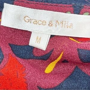 GRACE & MILA Women’s Navy Red Floral Chiffon Pleated Long Sleeve Blouse Size Medium. Good pre-owned condition. Gentle signs of wear. All measurements are approximate.