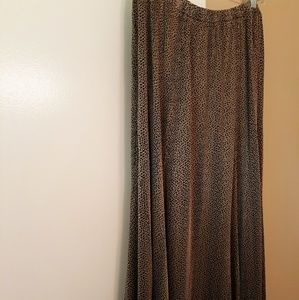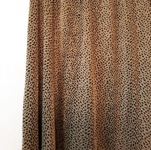 A1068. I love the way this skirt moves and feels! Not sure what leopard skin really feels like, but... this is great! The skirt has wide gores to allow it to fit at the waist and swirl at the hem. Tags are missing and worn, but it is well-made. A luscious brown, nearest to color in second photo, has a lovely shimmer to it. Take it in your suitcase for easycare style. Waist= 15.5 - 27"; W@Hem = 53"; L = 34".