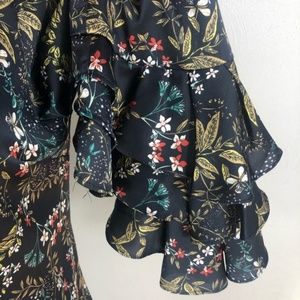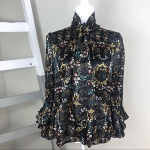 This shirt is so cute! It has a silky feel, button front, tie collar, tiered sleeves and a great floral pattern. Perfect for adding some flare to your work wardrobe or for a special occasion. ▫️ Color: black gold pink green white multi ▫️ Materials: 100% polyester ▫️ Condition: EUC / excellent preowned condition with no known flaws or signs of wear ▫️ Questions? Just ask 🖤