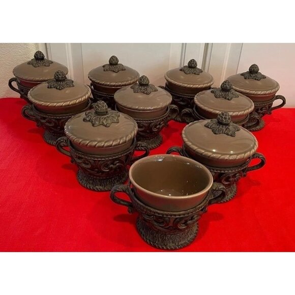 up for sale is a GRACIOUS GOODS GG Collection Brown Ceramic Bowl and Lid with Detailed Ornate Acanthus Leaf Motif Base....sale is for 1 ONE......this is the RARE BROWN SERIES