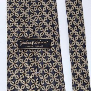 GRAHAM & LOCKWOOD LONDON ENGLAND SILK TIE TAN BLACK GEOMETRIC SATIN 4" X 58"