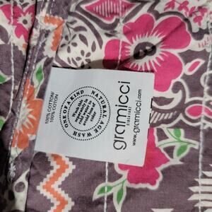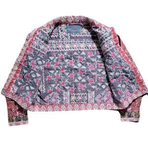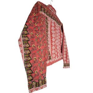 This vibrant Gramicci Women’s Cropped Quilted Jacket in size L features a bold orange Aztec-inspired print, perfect for adding a boho-chic flair to your wardrobe. The jacket showcases a blend of bohemian and cottage-core styles with its intricate floral patterns and geometric designs. Designed with a classic button-up front, this jacket also features a structured collar and functional chest pockets, adding both style and utility.