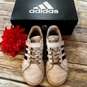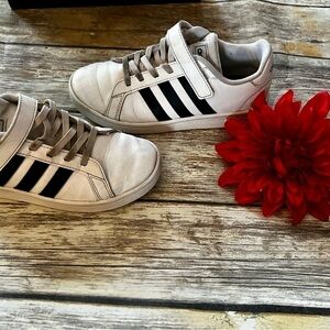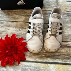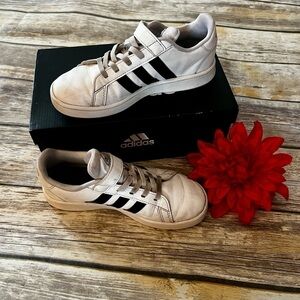Grand court Adidas. Size 2. Elastic laces stretch and pull, hook loop top strap, easy on/off. White with black tri stripe. Good condition, all wear show in photo. Synthetic leather upper. Rubber sole. Unisex.