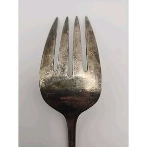 The product is a Wm. Rogers & Son Grand Elegance silverplate serving fork, featuring an Art Nouveau style. This post-1940 piece from the WM Rogers Mfg Co is designed for serving cold meats, with extra plate silverplating for added durability and elegance. The pattern of the serving fork is characterized by its intricate and ornate design, making it a stylish addition to any flatware collection.