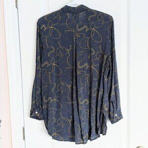 GRAND & GREENE chain print Navy blouse button down shirt adjustable sleeves L @P