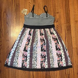This charming sundress combines playful patterns and a flattering silhouette for an easy, breezy summer look. The bodice features black-and-white horizontal stripes with a gathered bust, while the skirt boasts vertical patchwork-style floral panels in pink, purple, and black hues. Perfect for festivals, beach days, or casual weekend outings. Brand new with tags attached.