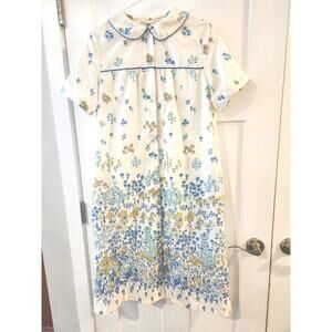 Clean and in remarkably good condition, this one has it all~~~right down to the pearl snaps and the peter pan collar! Pretty blue floral on white, cotton blend Muumuu, by Beco Originals in a size medium. Please follow provided measurements as vintage label sizing is not true to today's sizing. 20.5 in pit to pit, 15.5 in shoulder to shoulder, 42.5 in Length from shoulder to hem, 42 "ish" in waist. No stains, holes or odors. From a smoke-free home.