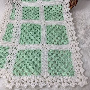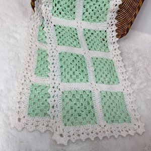 Handmade crocheted Granny Square runner. Green and white. Perfect touch to a nursery. 41” long x 10 1/2” wide