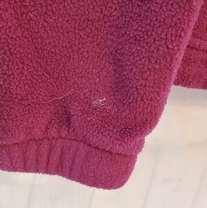 Grape purple fleece in size Medium with minor pilling. Spot on the wrist shown in picture. Otherwise in GUC. Zippers in excellent working condition. Side pockets close with zippers.