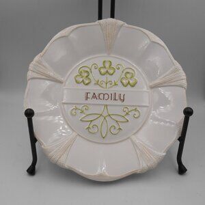 Rare hard to find salad /dessert plate is 8 inches in diameter in overall good condition for its age. It has the embossed word Family, shamrock, and ivory Celtic knot trim/rope design on the edges. This item would make a great gift. Minor flaws may be present due to issues in manufacturing: paint imperfections, glaze skips, glaze pops, glaze running, firing pin/stilt marks, kiln marks or air bubbles. This item has its original tag on the bottom but shows some wear due to age and storage which might include dust/dirt, and bottom base scuffs. There is no obvious damage like breaks, chips or cracks. Colors in photos may vary slightly due to lighting. All dimensions are approximate. Please do take the time to review the pictures because this is part of the description of the item(s) you are buying. Rulers/measuring tape, display stands, weight measuring devices are not included with the item(s) being sold if displayed in the pictures. They only provide information about the featured item(s).
