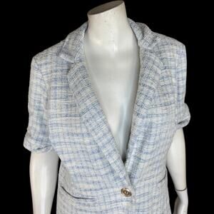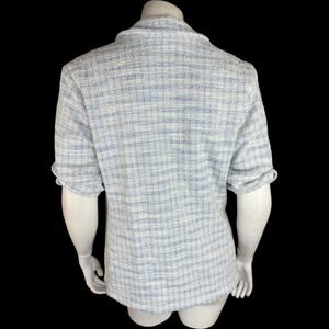This item is a GRAVER Susan Graver Knit Tweed Short Sleeve Blazer in the color Wind Blue. It is a size small. This item has never been worn but has been laundered and may show signs of wash wear.