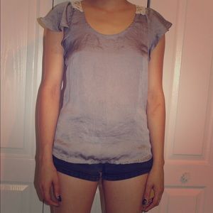Gray silk top with beautiful detailing in the back. Short ruffled sleeves