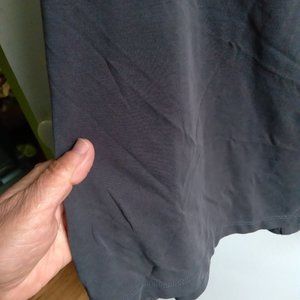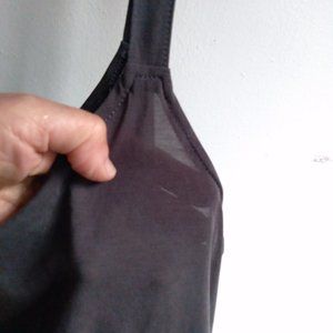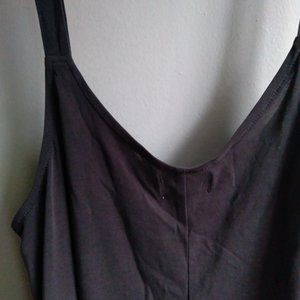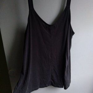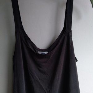 This is a gray tank top with thin straps, from Old Navy - the size is SP (small petite). The top has a loose fit, and is slightly sheer. Fabric feels like polyester blend with spandex. Previous owner, my sister, removed fabric/care tag.
