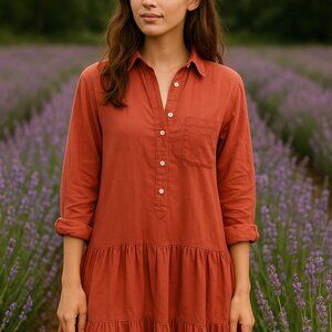 Features: Tiered design, collared neckline, button front