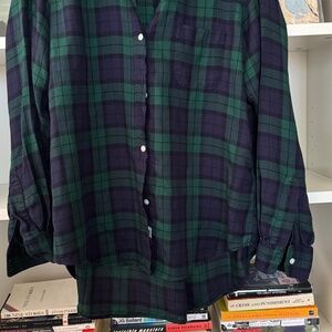Button up flannel top. Blue and green plaid pattern. 100% Lyocell. Long Sleeve. Left chest pocket. Darting on back. Great preloved condition. Size 01/XS. Approximate measurements: Underarm to underarm 18in, Length from front 25in, length from back 28in
