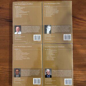GREAT COURSES Great World Religions--Buddhism, Islam, Judaism, Christianity--bundle of 4 individual transcript books, each new in package (shrink wrapped in plastic). These transcript books are authored by the following scholars: Professor Malcolm David Eckel (Buddhism, course no. 6105), Professor John L. Esposito (Islam, course no. 6102), Professor Isaiah M. Gafni (Judaism, course no. 6103), and Professor Luke Timothy Johnson (Christianity, course no.6101). Excellent new-in-package condition.