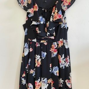 LIKE NEW - EXCELLENT CONDITION. This light and flowing Express dress features a soft ruffle around the neckline and a gorgeous tie detail. The rich colorful floral palette of pink, rose, and blue tones pops on the black background. The skirt features soft gathers. Side zipper. Fully Lined Excellent condition worn very few times. This dress is perfect for the office, date night, or a special occasion. It is just so pretty.