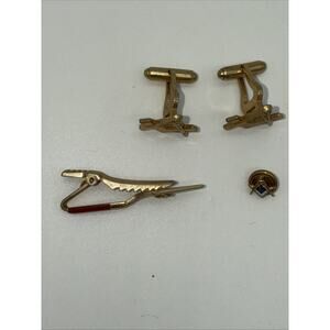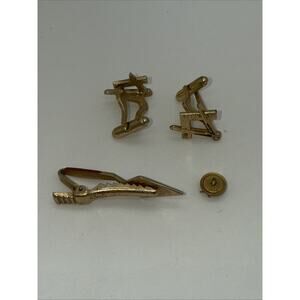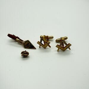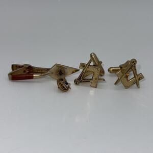 This vintage Masonic jewelry set includes a set of gold cufflinks, tie bar, and lapel pin, all adorned with a Masonic theme. The pieces are signed by Anson and are made of filled gold. This set is a rare and unique addition to any fashion or vintage jewelry collection, perfect for those with a passion for Masonic symbolism and history. The set exudes a sense of sophistication and classic elegance, making it a standout piece for any formal or Masonic event.