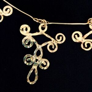 THIS NECKLACE IS STUNNING, IT'S VERY UNIQUE AND THE GOLD FINISH (PLATED) IS IN PERFECT CONDITION, IT'S ARTSY, YET CLASSICALLY ELEGANT. IT WILL ENHANCE ANYTHING YOU WEAR IT WITH, AND IT'S SOMETHING THAT CAN BE YOUR GO TO SIGNATURE PIECE..FABULOUS WITH BLACK OR WHITE, OR REALLY ANY OTHER COLOR, COMFORTABLE TO WEAR, IT CLOSES WITH A SINGLE HOOK AND LOOP. THE NECKLACE MEASURES 14" AND IS MEANT TO BE A CHOKER, EACH PENDANT MEASURES 2.25" IN LENGTH. PURCHASED AT THE GREEK MUSEUM IN ATHENS, HAND MADE.
