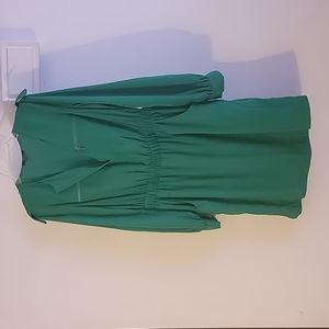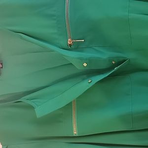 One of those dresses that you can throw on with any type of shoe and accessories and it still looks great. A nice bold green, and all the pockets are real! Elastic waistband with snap-up neckline.