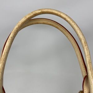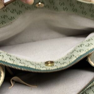 Green Dooney & Bourke Satchel bag. There is a main zipper compartment and on each side a snap closure department. There are a few stains on the inside. The outside is very clean. The handle does show wear so please REVIEW THE PICTURES WELL. This is a medium-largish size bag. Measure 14x9x6.