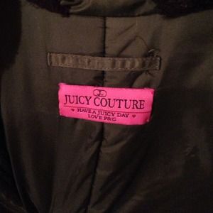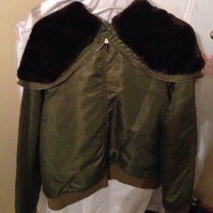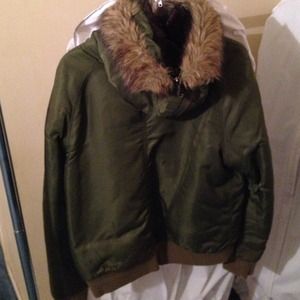 Green zip up nylon jacket. Also has toggle buttons. Fur hood can be zippered up or down depending on the look you are going for. In great condition, no stains just normal wear. Comes with original Juicy Couture garment bag.