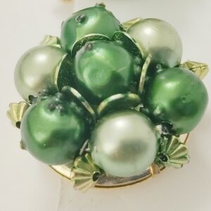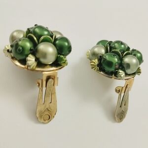 These classic 1960s multi color green pearl earrings are fun and funky. Wear them with a Christmas sweater for the full effect.