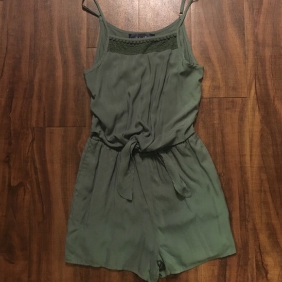 THIS GREEN ROMPER COMES WITH A DETAILING AROUND THE COLLAR BONE. IT HAS A TIE AROUND THE WAIST TO TIGHTEN, AND THE STRAPS CAN BE TIGHTENED AS WELL. IT WAS ONLY WORN ONCE.